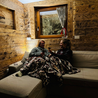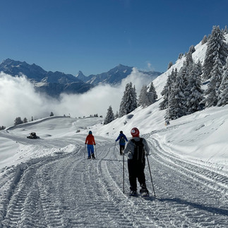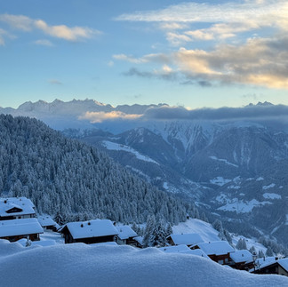 Arriving in Reideralp, we continued along another snowshoe trail that led us around the charming village. We paused at a local restaurant for a well-deserved beer on the patio. As we savored the stunning valley views, we were treated to a mesmerizing sight—a "sun dog" phenomenon, When sunlight dances through ice crystals in the atmosphere, it creates a breathtaking display of multiple rainbows encircling the sun. These ethereal arcs, paint the sky with a mesmerizing palette of colors.