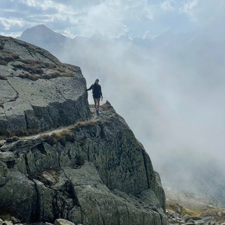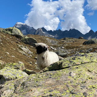 The next morning, we rose relatively early and began our trek. We started by weaving up the side of the mountain, following a trail that led to a flatter area with large rock slabs covered in grass and moss. Along the way, we encountered a herd of black-nose sheep and spent some time with them. They were surprisingly friendly! Continuing on, we traversed a long-standing rock slide, occasionally struggling to find the path but eventually following the "red white red" trail markers to guide our way.