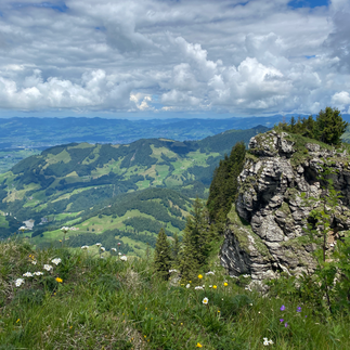 The journey from Innerthal unveils a 600-meter elevation ascent through a captivating landscape. Envision a trek through lush forests and pastures, where cows graze on rolling hills and wild flowers blow in the wind. As we casually ascend Gross Aubrig the view of lake Zurich, Greifensee, and Pfäffikersee, come into sight. Like most summits, there is a summit book at the cross to sign and write a little note.